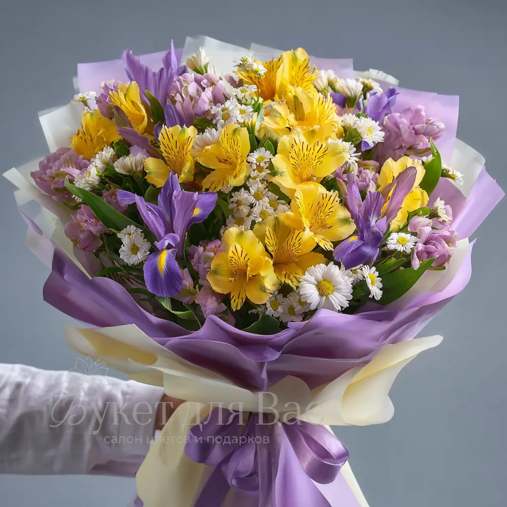 Композиция в жёлто-фиолетовой гамме — как всплеск света в пасмурный день. Альстромерии создают ощущение тепла и оптимизма. Прекрасно подойдёт для поднятия настроения или неожиданного подарка.