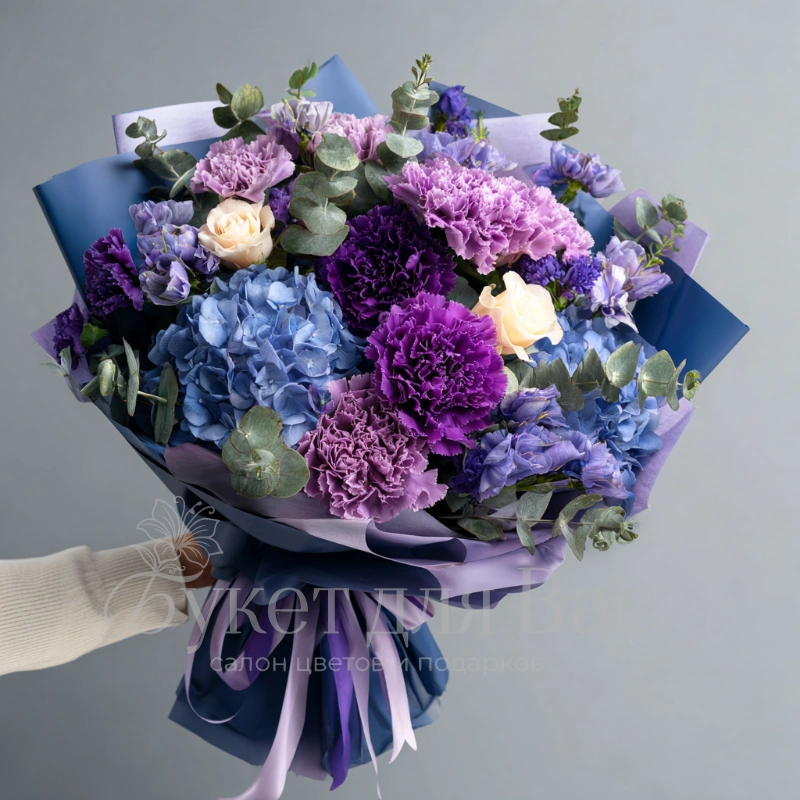Фиолетово-сиреневые гвоздики в сочетании с гортензиями переливаются, как ночное небо. Отлично подойдет для романтического вечера.