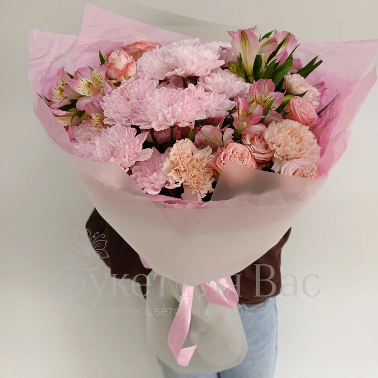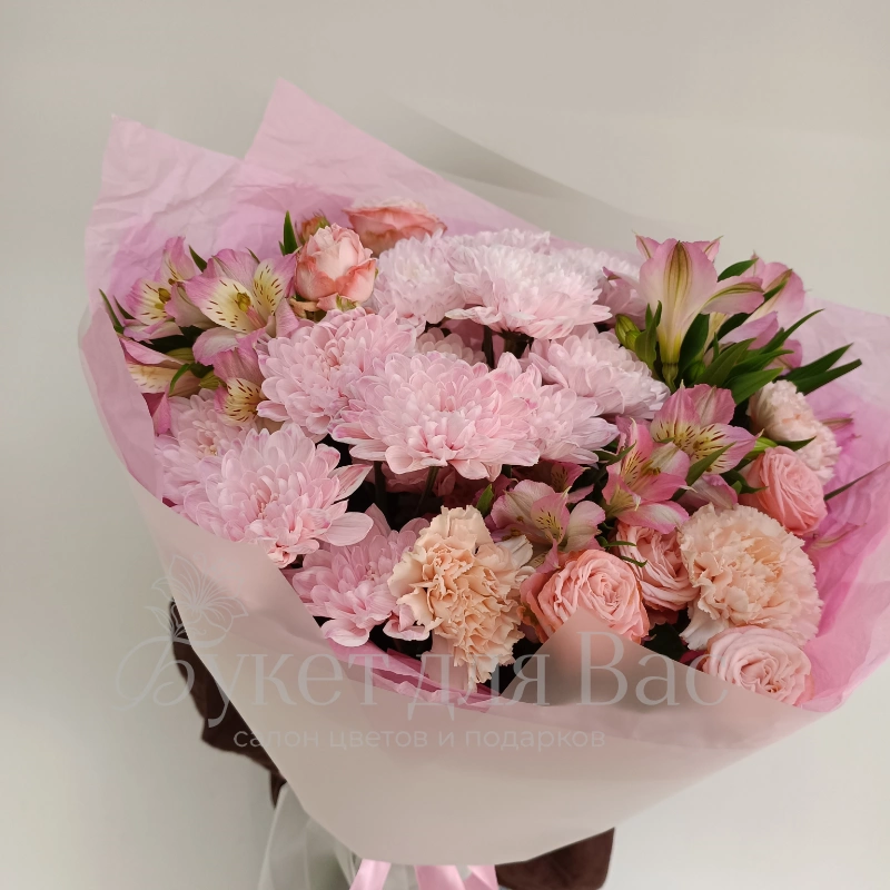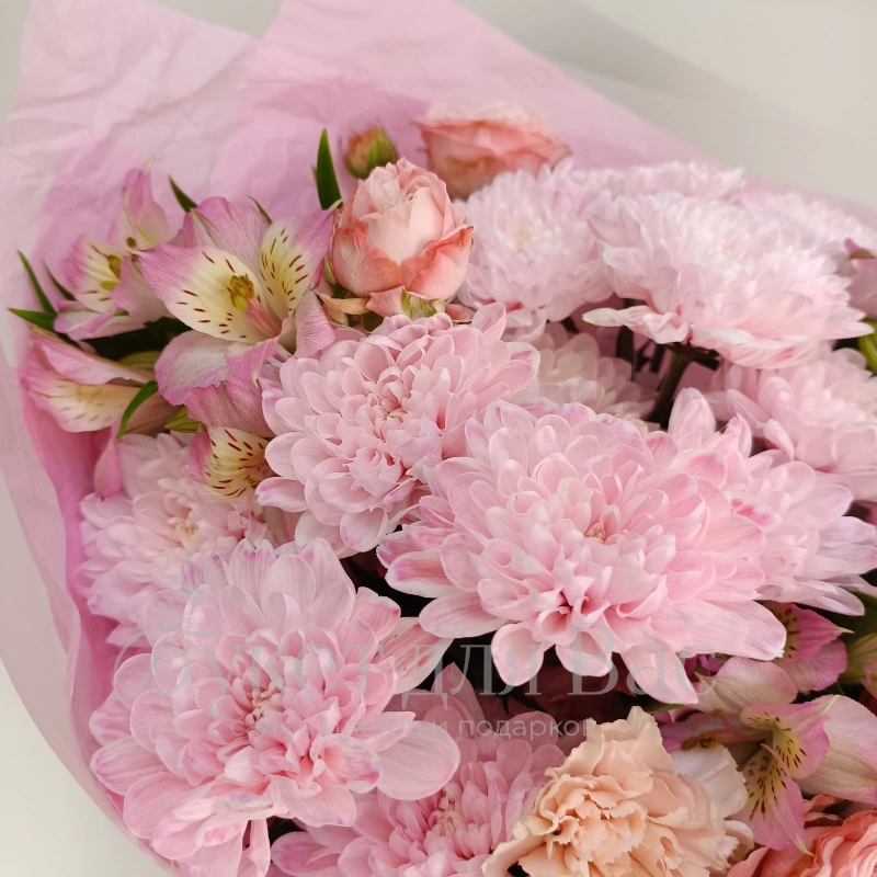 Нежный букет в розовых тонах воплощение легкости и романтики. Ассорти из хризантем, роз и альстромерий, окутанное воздушной упаковкой, станет прекрасным выражением ваших чувств. Этот букет привнесет в любой день нотку очарования и подарит истинное эстетическое наслаждение.